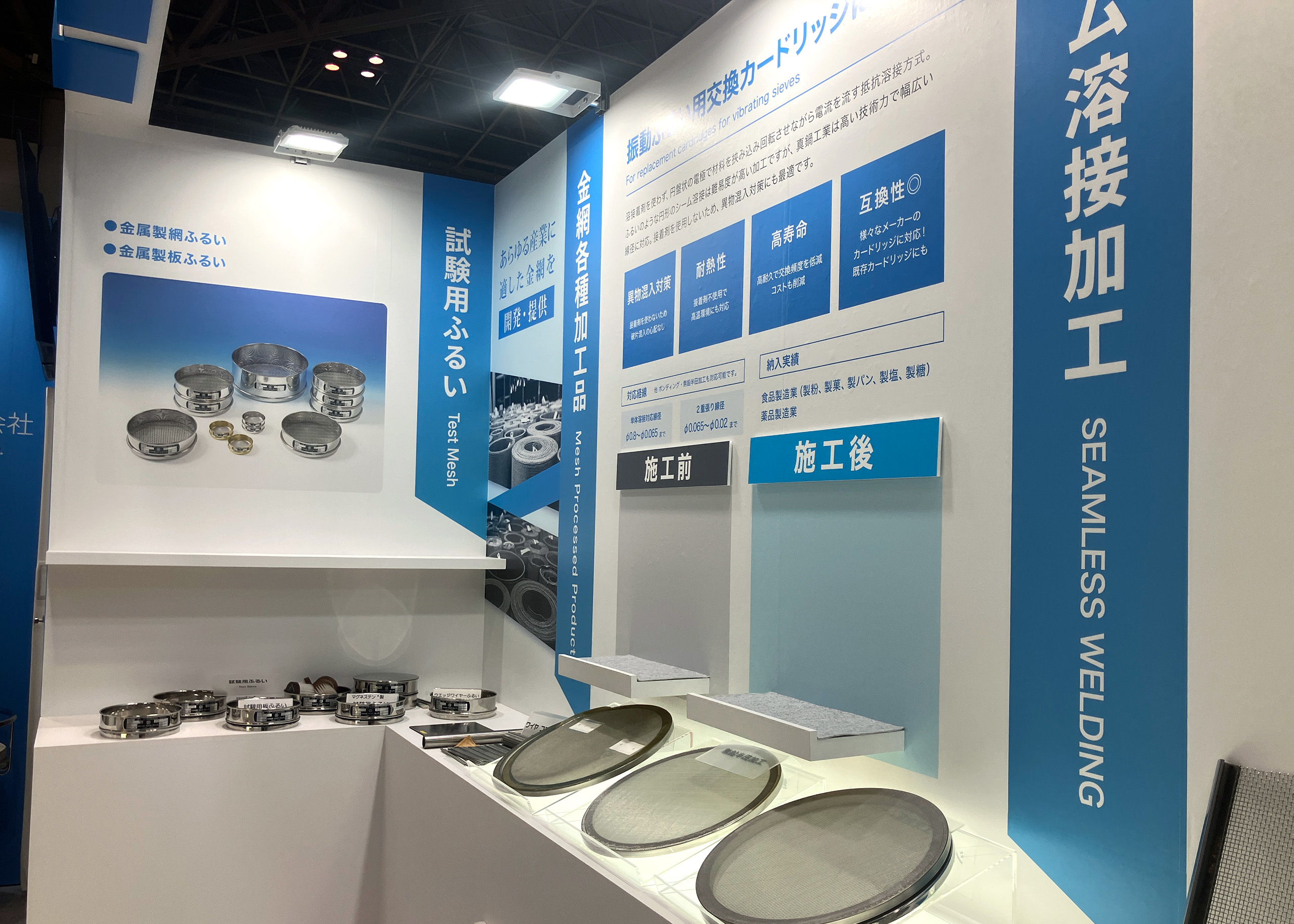 ブース上部に使っている金網もポイント。自社製品やそれをイメージする構造などをブースづくりに